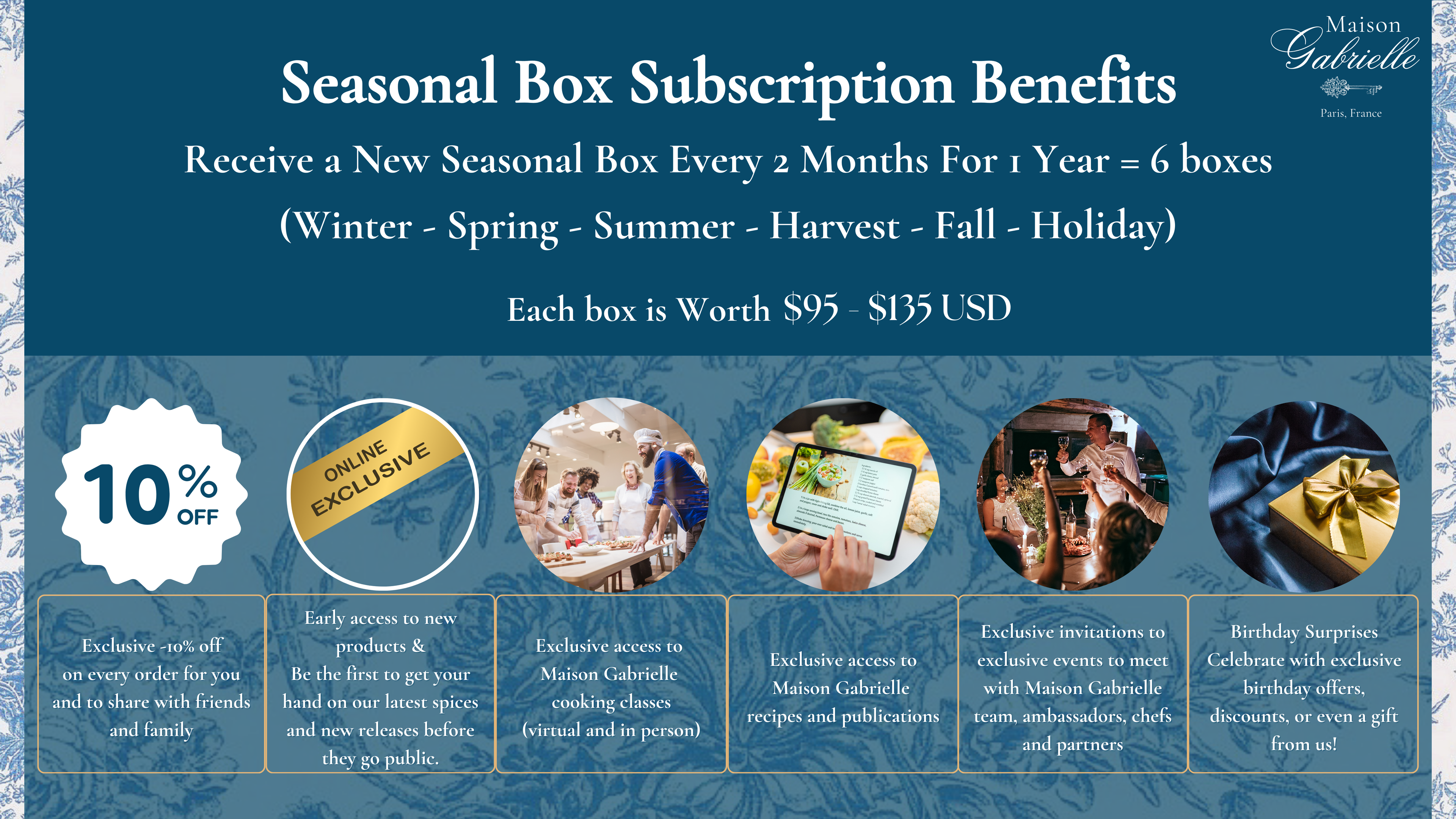 Les coffrets d'épices exclusifs de Maison Gabrielle, expédiés chaque saison, proposent une sélection soignée d'épices rares, triées sur le volet, et de classiques intemporels pour rehausser votre expérience culinaire. Chaque livraison comprend des herbes et des épices gastronomiques de grande taille, provenant du monde entier, associées à des recettes exclusives et à un cadeau surprise, le tout conçu pour compléter les saveurs de la saison. Ancrées dans le luxe français, ces boîtes saisonnières offrent un accès VIP à la communauté Maison Gabrielle, débloquant des avantages exceptionnels et offrant une expérience véritablement luxueuse directement à votre porte depuis Paris.